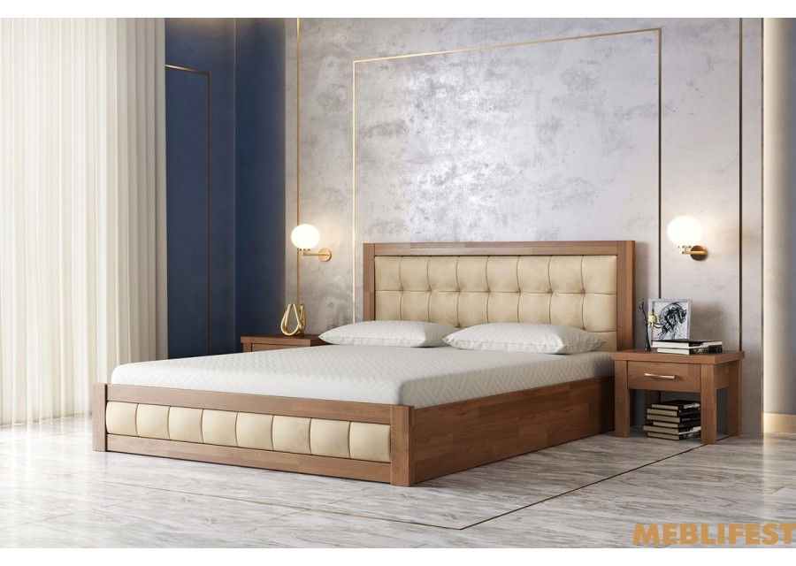 Пропонуємо придбати елегантне ліжко «Мадрид Плюс», виготовлене з натурального щита бука та доповнене м’яким узголів’ям і м’якою вставкою в ізніжжі.