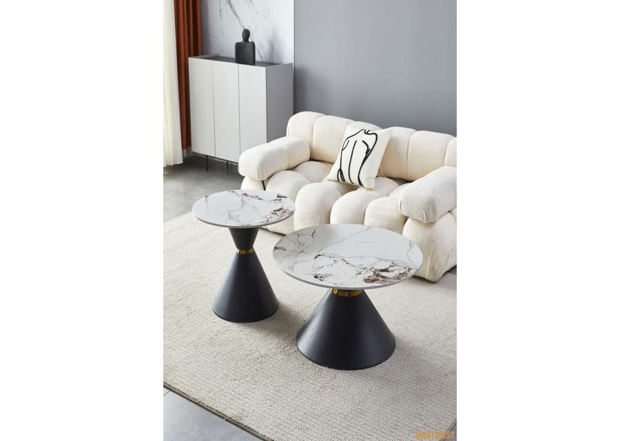 Моделі відзначаються міцною та стабільною конструкцією. Стільниці виготовлені з керамічної плити з ефектом натурального каменю та характерними прожилками, що робить кожен столик унікальним. Поверхня стійка до подряпин, механічних пошкоджень, впливу температур і вологи. Вона не вбирає запахи, не піддається утворенню цвілі та легко очищується, що забезпечує зручність у щоденному використанні.