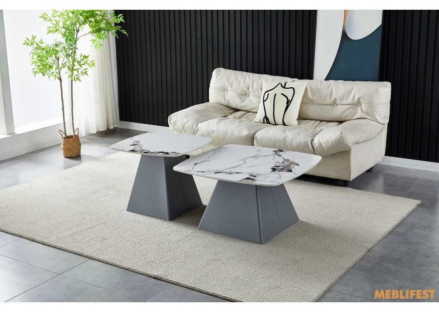 Моделі відзначаються міцною та стабільною конструкцією. Стільниці виготовлені з керамічної плити з ефектом натурального каменю та характерними прожилками, що робить кожен столик унікальним. Поверхня стійка до подряпин, механічних пошкоджень, впливу температур і вологи. Вона не вбирає запахи, не піддається утворенню цвілі та легко очищується, що забезпечує зручність у щоденному використанні.