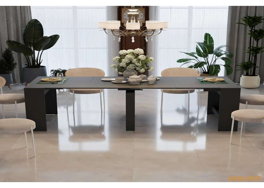 «ПІТОН Лайт» — чудовий вибір для тих, хто любить приймати гостей та збирати родину за одним столом. Завдяки продуманому механізму трансформації модель легко розкладається всього за кілька рухів і перетворюється на великий обідній стіл довжиною 2356 мм. За ним комфортно розмістяться до 12 осіб.