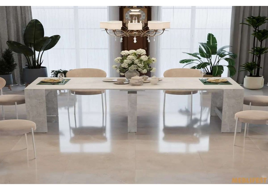 «ПІТОН Лайт» — чудовий вибір для тих, хто любить приймати гостей та збирати родину за одним столом. Завдяки продуманому механізму трансформації модель легко розкладається всього за кілька рухів і перетворюється на великий обідній стіл довжиною 2356 мм. За ним комфортно розмістяться до 12 осіб.