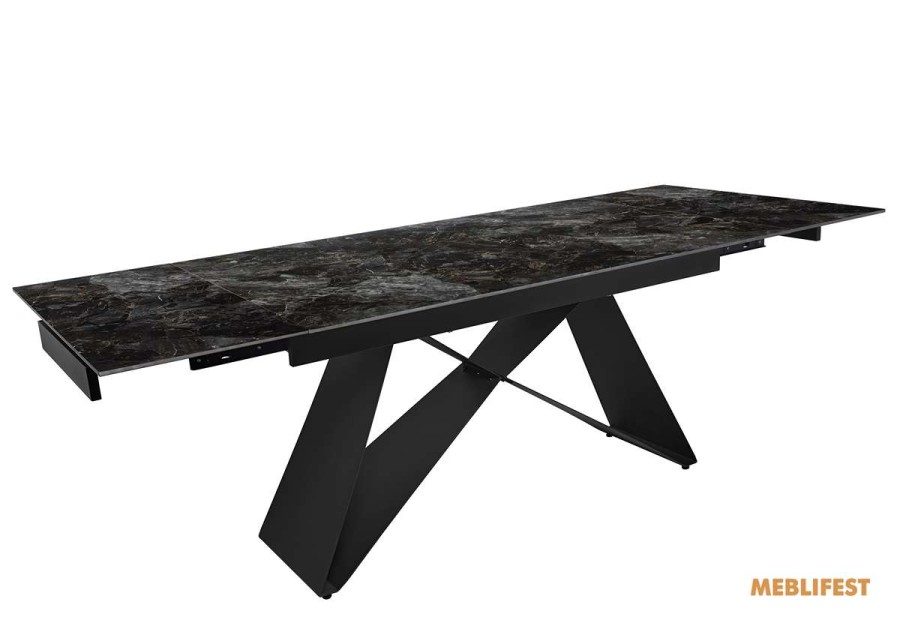 Розкладний обідній стіл Roland від виробника Bjorn — ідеальний вибір для поціновувачів сучасної естетики та функціональності. Завдяки елегантному дизайну він гармонійно впишеться в інтер’єр кухні, вітальні, а також стане ефектним елементом обідньої зони на заскленій терасі чи в заміському будинку. Модель поєднує стриманий зовнішній вигляд із надійною конструкцією, що робить її практичною для щоденного використання. Стільниця виготовлена з керамічної плити з виразними прожилками, які імітують текстуру натурального каменю. Завдяки унікальному малюнку кожен стіл має неповторний вигляд. Керамічна поверхня відзначається високою стійкістю до подряпин, зношування та перепадів температур, не боїться впливу хімічних засобів і легко очищується. Матеріал є гігієнічним, не вбирає рідини та не виділяє шкідливих речовин. Опори столу виконані з міцного пофарбованого металу, що забезпечує стабільність і довговічність конструкції. Ключовою перевагою моделі є розсувна стільниця, яка дозволяє збільшити довжину столу з 140 до 200 см. Надійний металевий механізм трансформації працює плавно та розрахований на інтенсивну експлуатацію — понад 10 000 циклів розкладання, що гарантує зручність і надійність протягом тривалого часу.