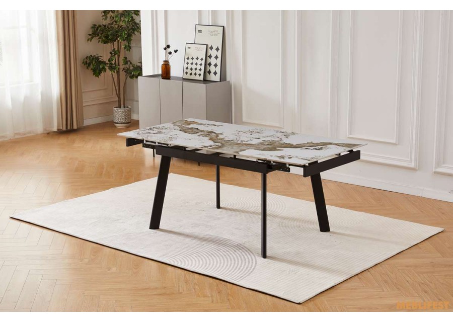 Розкладний обідній стіл Velvet від виробника Bjorn — ідеальний вибір для поціновувачів сучасної естетики та функціональності. Завдяки елегантному дизайну він гармонійно впишеться в інтер’єр кухні, вітальні, а також стане ефектним елементом обідньої зони на заскленій терасі чи в заміському будинку. Модель поєднує стриманий зовнішній вигляд із надійною конструкцією, що робить її практичною для щоденного використання. Стільниця виготовлена з керамічної плити з виразними прожилками, які імітують текстуру натурального каменю. Завдяки унікальному малюнку кожен стіл має неповторний вигляд. Керамічна поверхня відзначається високою стійкістю до подряпин, зношування та перепадів температур, не боїться впливу хімічних засобів і легко очищується. Матеріал є гігієнічним, не вбирає рідини та не виділяє шкідливих речовин. Опори столу виконані з міцного пофарбованого металу, що забезпечує стабільність і довговічність конструкції. Ключовою перевагою моделі є розсувна стільниця, яка дозволяє збільшити довжину столу. Надійний металевий механізм трансформації працює плавно та розрахований на інтенсивну експлуатацію — понад 10 000 циклів розкладання, що гарантує зручність і надійність протягом тривалого часу.